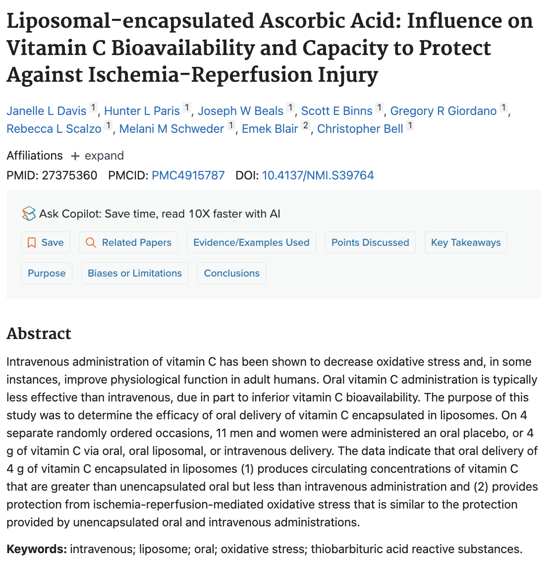 この研究の目的は、リポソームに包まれたビタミンCの経口投与の効果を明らかにすることであった。11人の男女が、4回にわたりランダムに順序が決められた条件で、経口プラセボ、経口ビタミンC4g、リポソーム化経口ビタミンC4g、または静脈内投与でビタミンCを投与された。